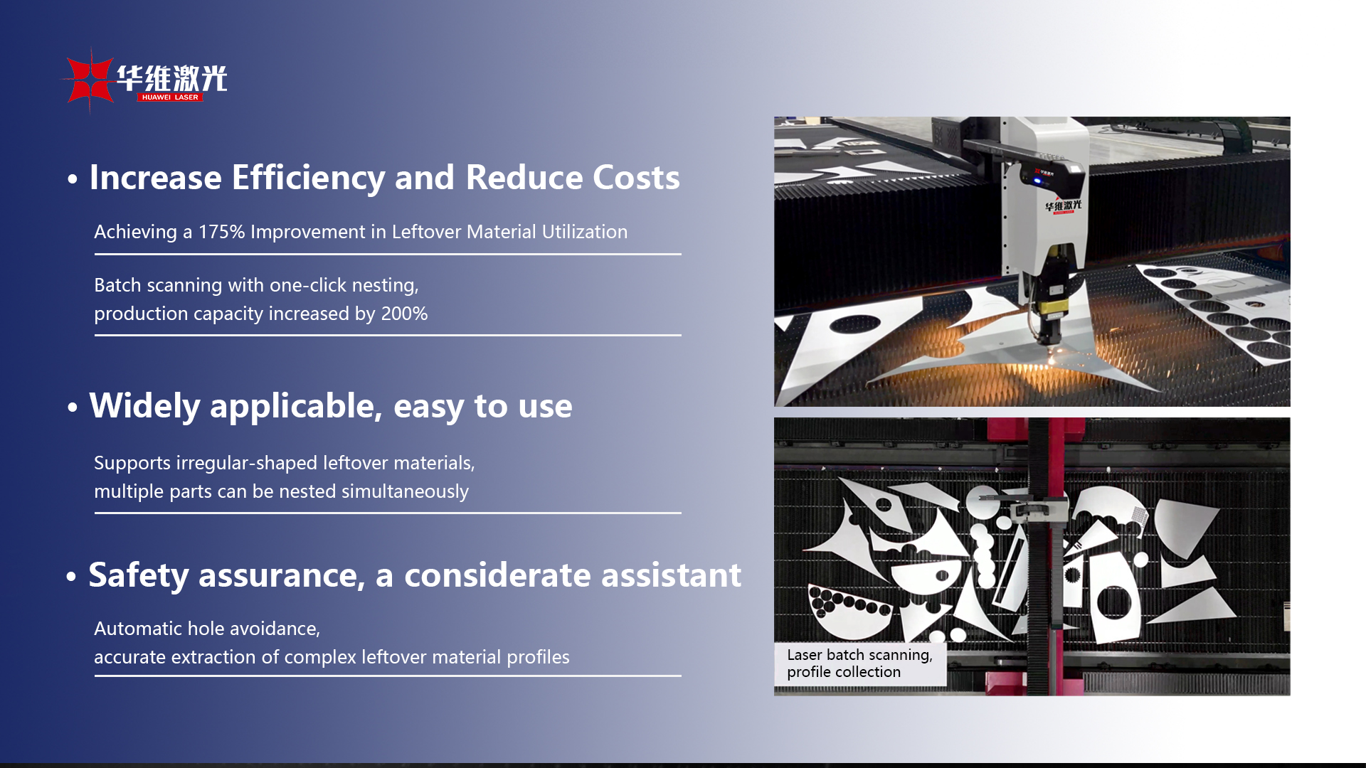 Интелигентниот систем за реутализација на Huawei Laser е способен да обработува неправилно обликувани остатоци, ракување со комплексни контури и извршување на прецизно гнездење на дел. Без разлика дали се занимава со кружни, правоаголни или разни неправилни форми на отпад, системот може интелигентно да го препознае и оптимизира планот за гнездење за да обезбеди ефикасна употреба на секое парче материјал. Покрај тоа, системот поддржува мулти-дел гнездење, подобрување на ефикасноста на производството, додека одржува прецизност на сечење и го намалува времето на обработка.